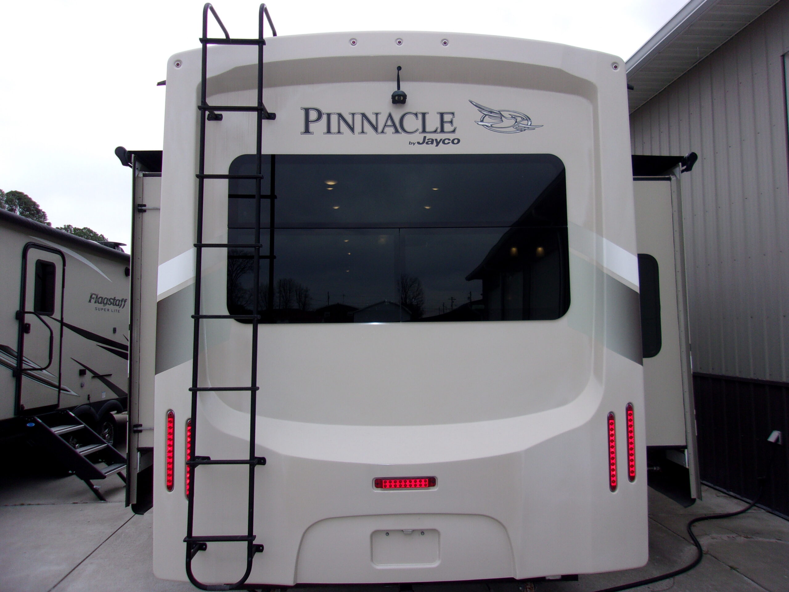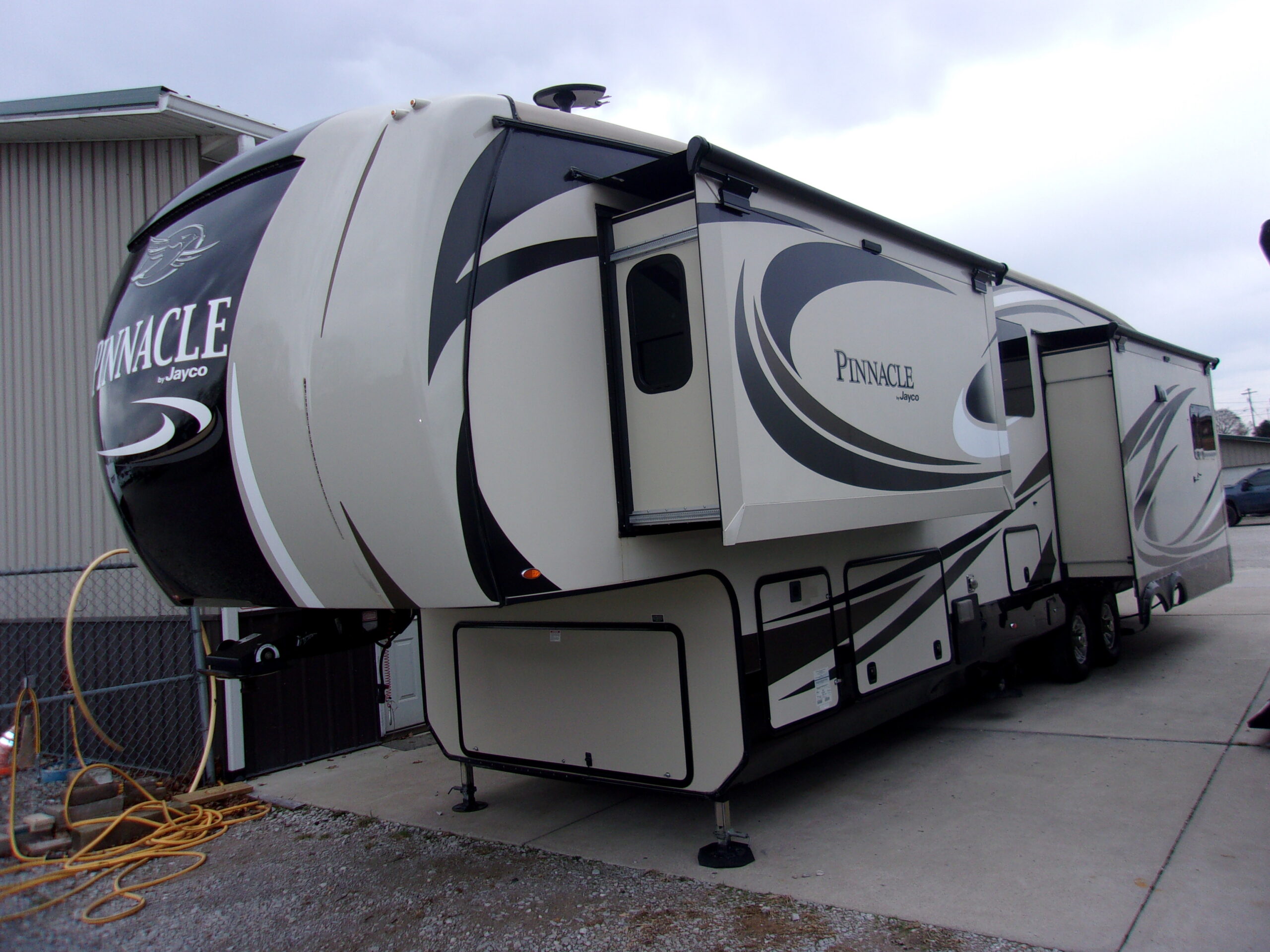 The 2017 Jayco Pinnacle 37RSTS is a luxury triple-slide fifth wheel featuring a distinct Electric Euro Lift Bed in the master bedroom and a rear living layout. It offers a residential-style kitchen with island, opposing slides in the living area, and high-end amenities like solid surface countertops and optional washer/dryer prep.