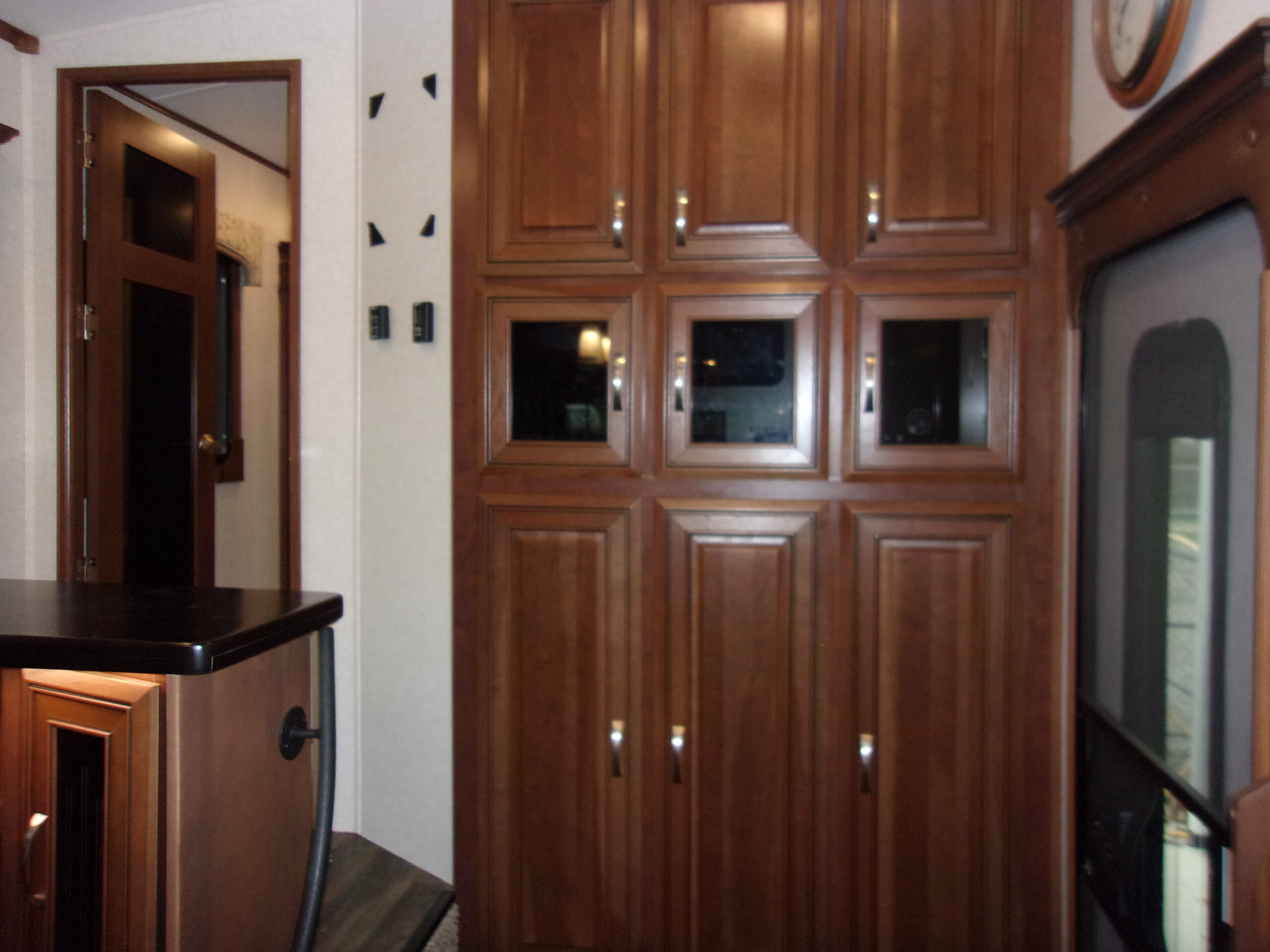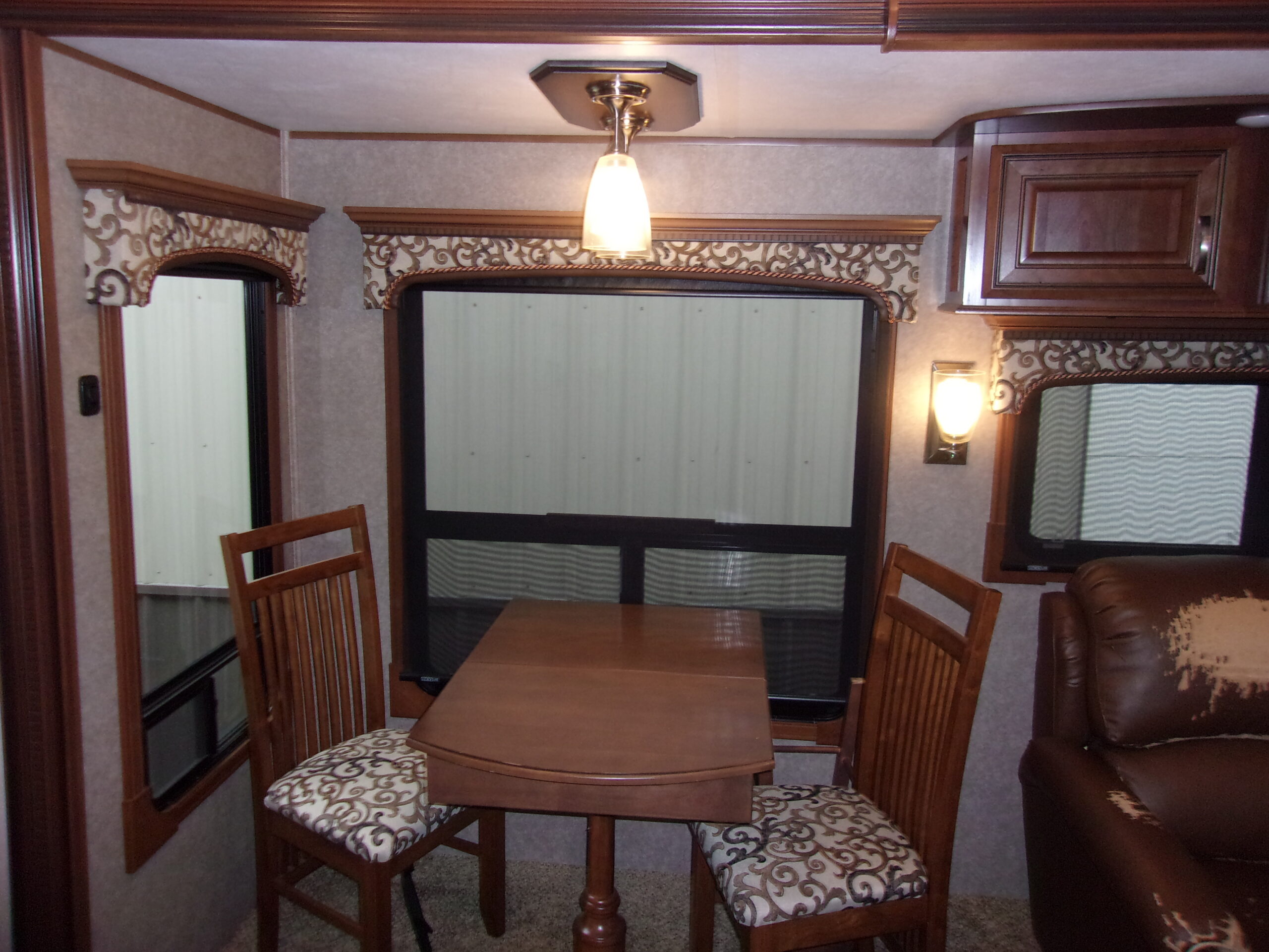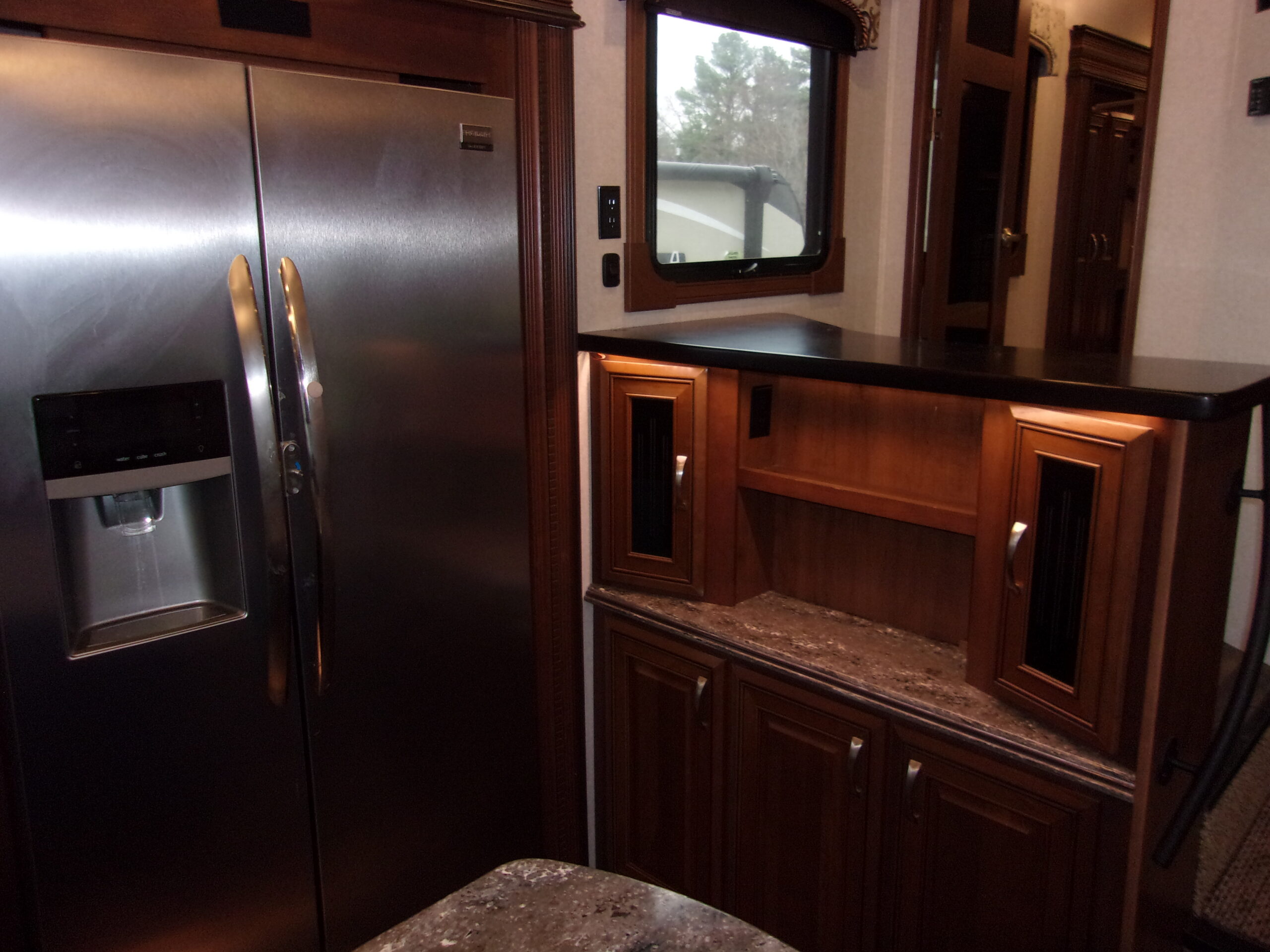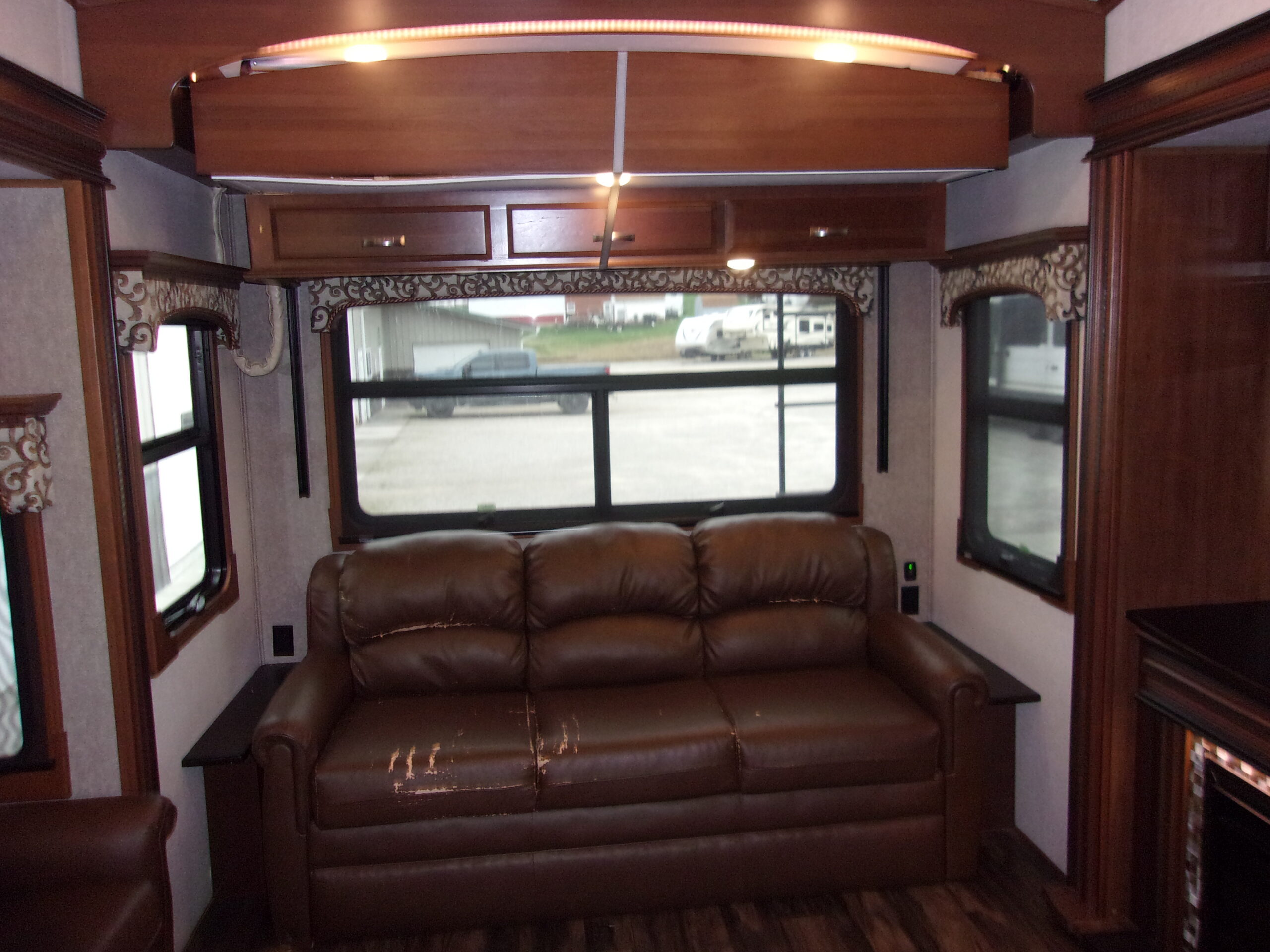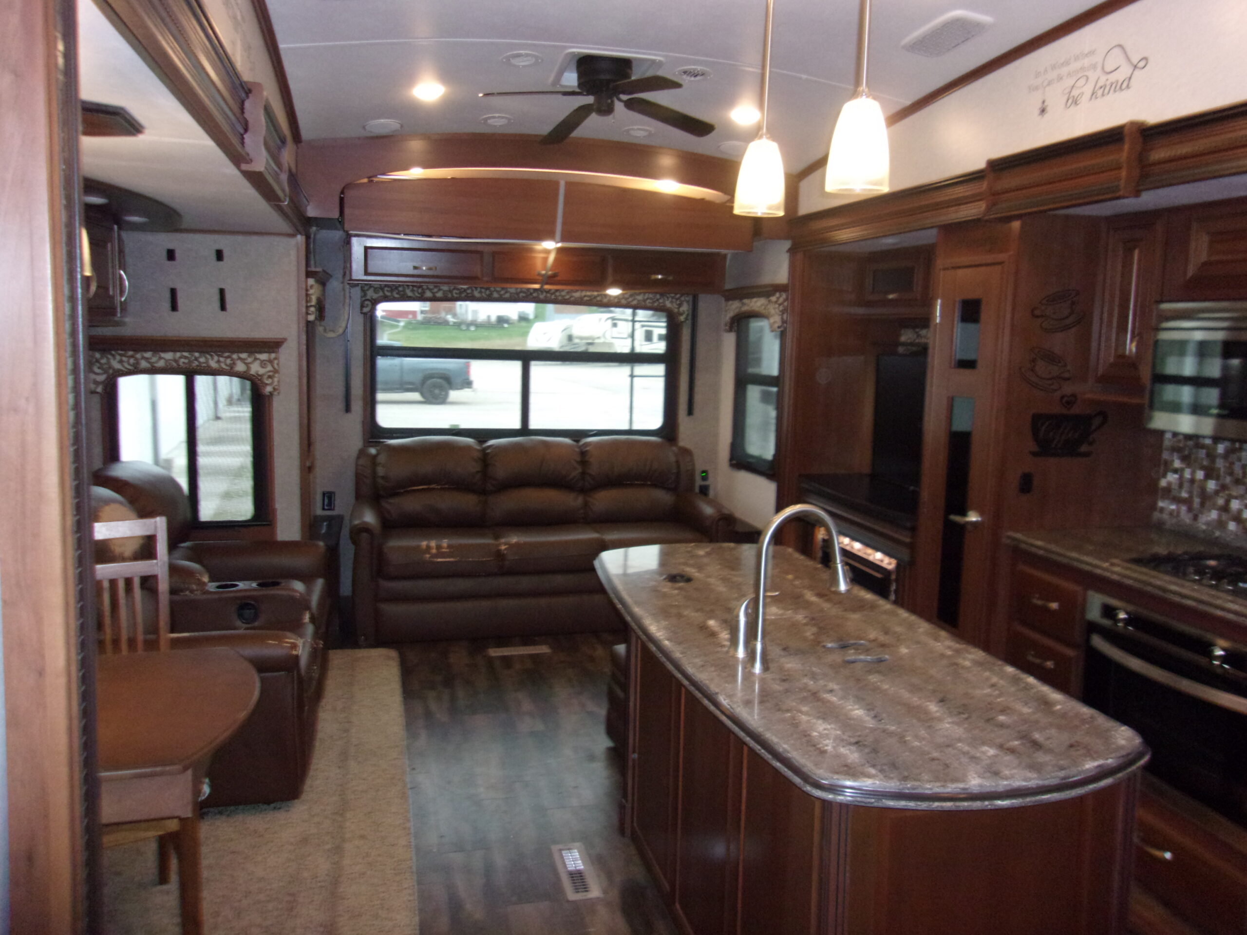 - Living Area: Rear entertainment center with fireplace, opposing slide-outs, and comfortable seating.