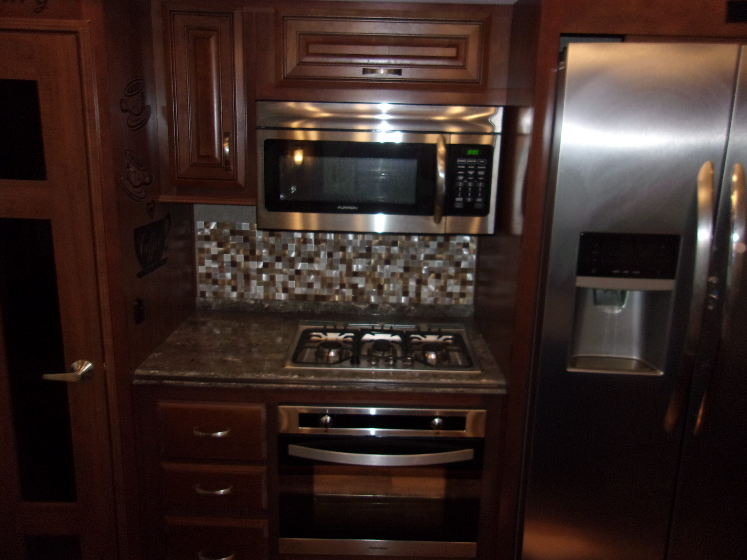 Kitchen: Island with double sink, residential refrigerator, microwave, and stove/oven combo.