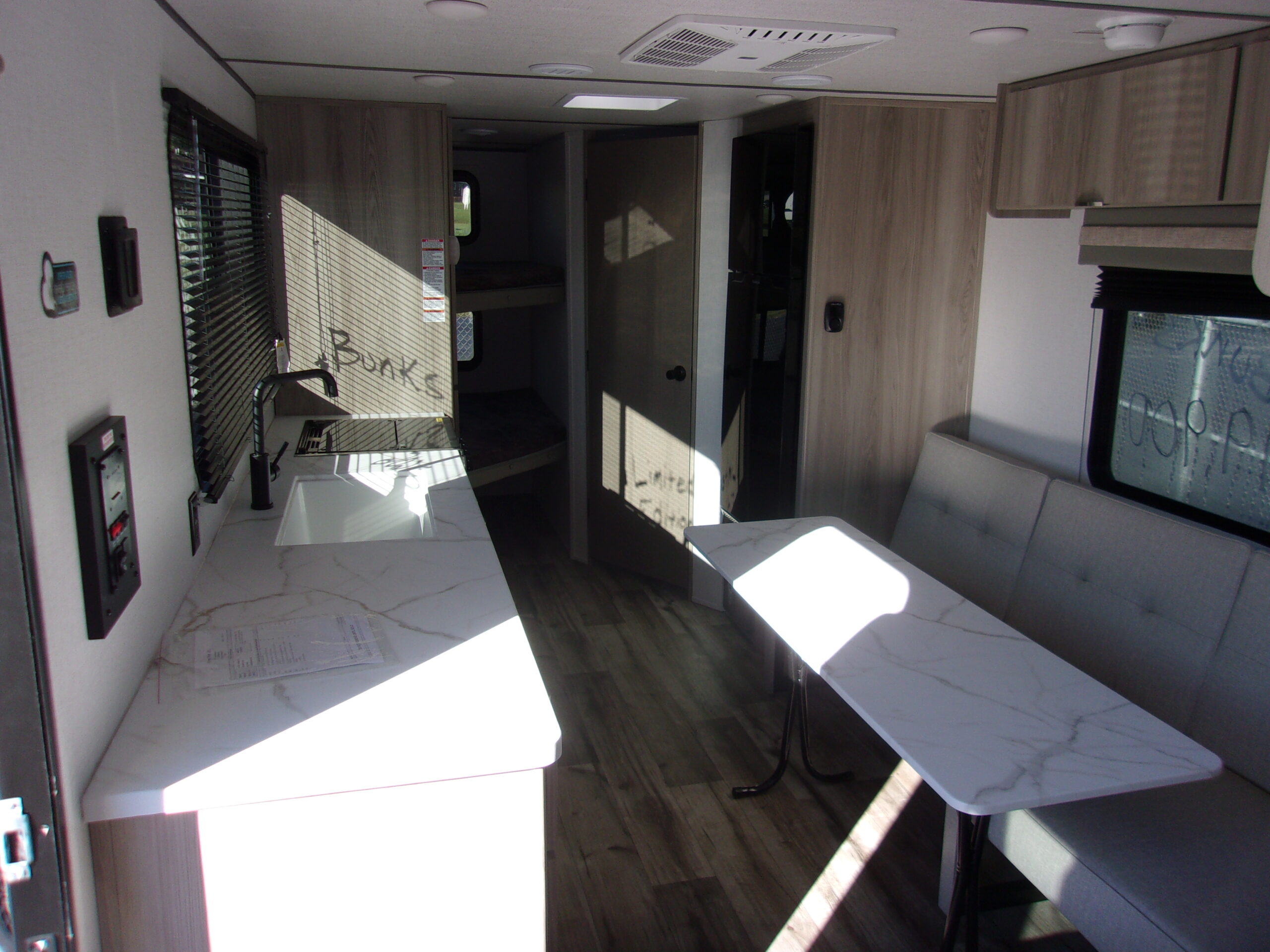 - Camping is made easy in this travel trailer with more sleeping space and lots of comforts! The kids or your guests will enjoy the double-size bunks in the back, along with the full bath close by for easy nighttime use. You’ll have the front private bedroom with a king bed all to yourselves, and there are dual bedroom wardrobes to keep your space neat and clean. Everyone can meet in the combined kitchen and living room to relax on the super U-lounge with a removable table while the chef of your group makes breakfast on the three burner cooktop. There is also a microwave oven for quick meals, plus a pantry and 10 cu ft large refrigerator for food storage!