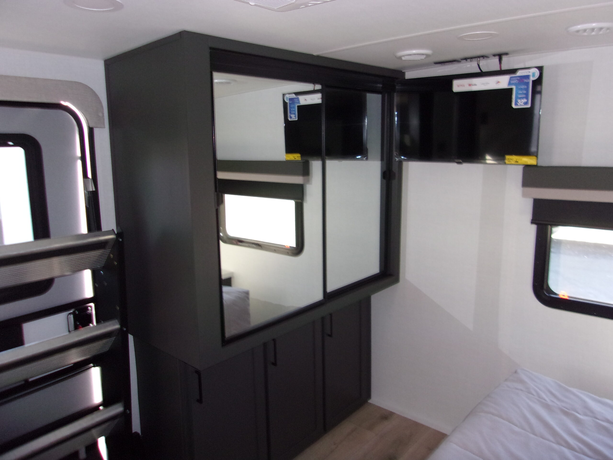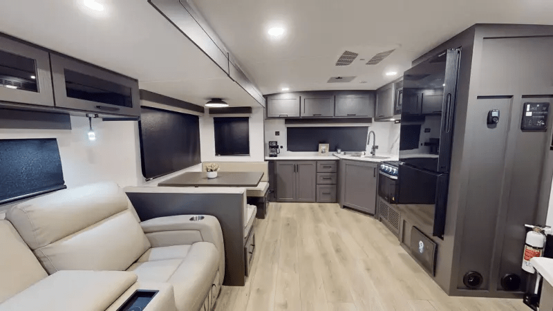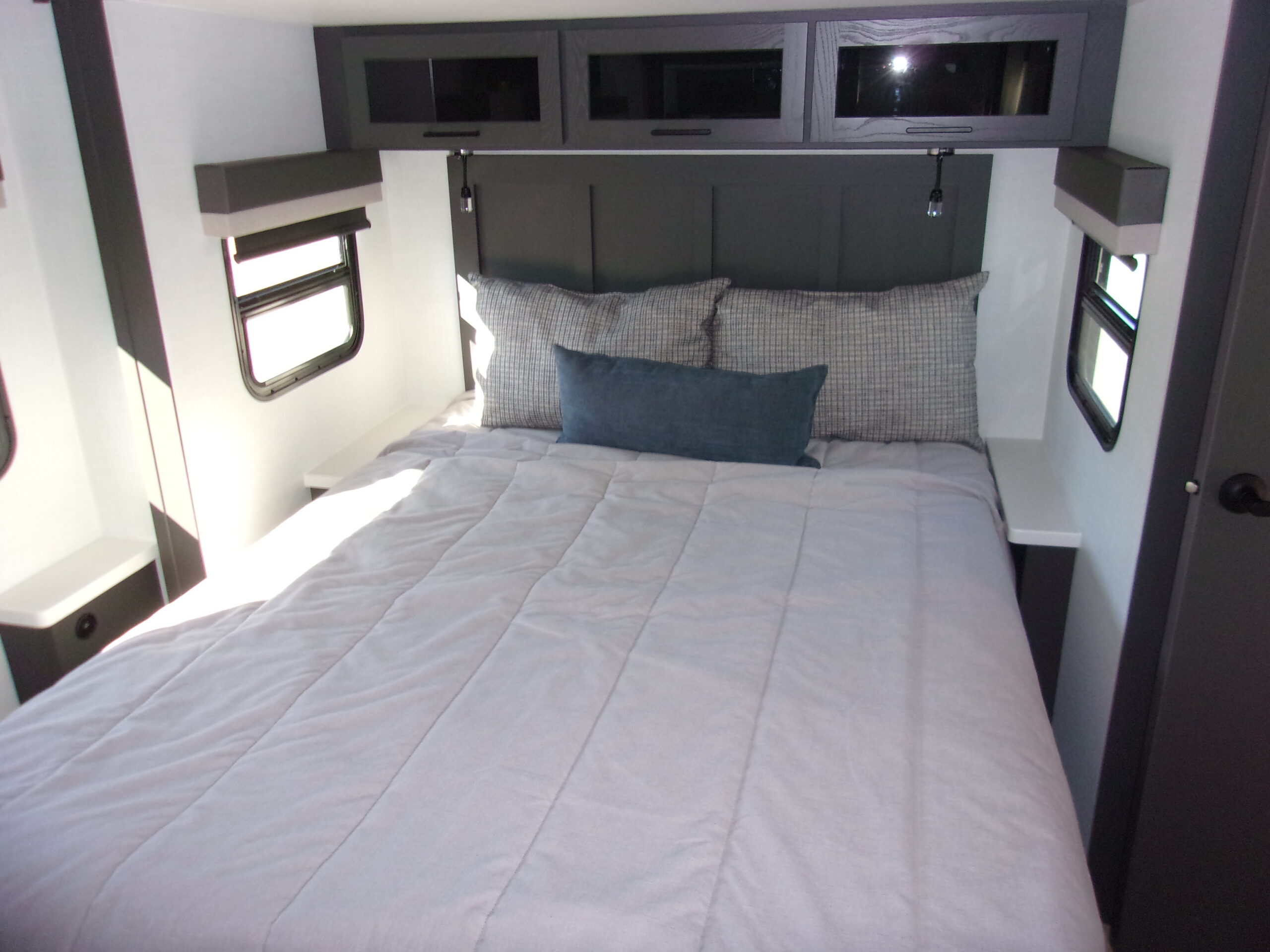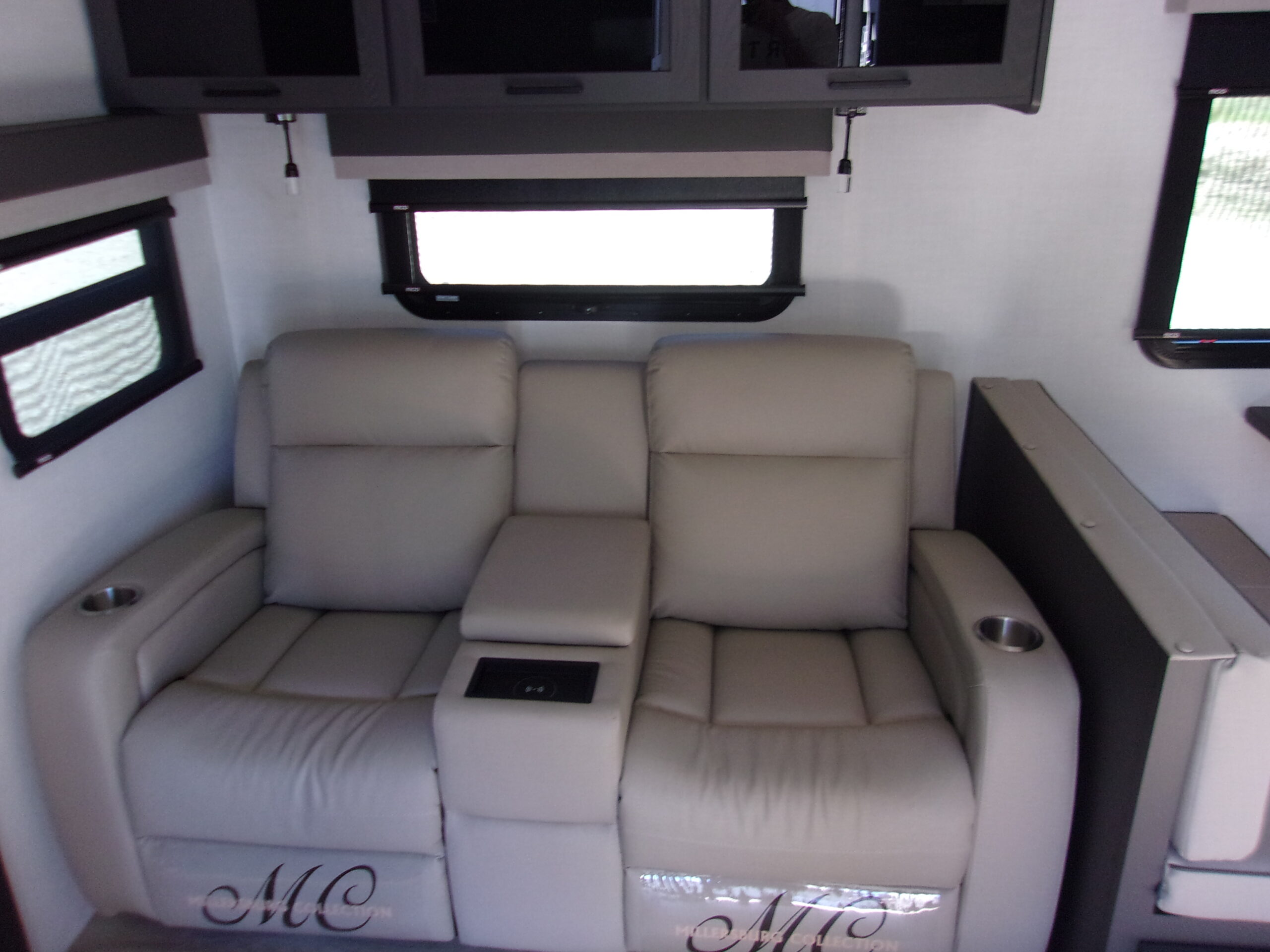 Holy counter space! This front kitchen offers a ton of counter space with a giant window to enhance the camping experience. The 67″ theater seating is conveniently located right in front of the entertainment center and the cozy space heating fireplace. The master bedroom offers a big 60″x 80″ queen bed slide out which makes the room feel residential. This bedroom has a separate entry and exit door that is also covered by the giant 21′ awning