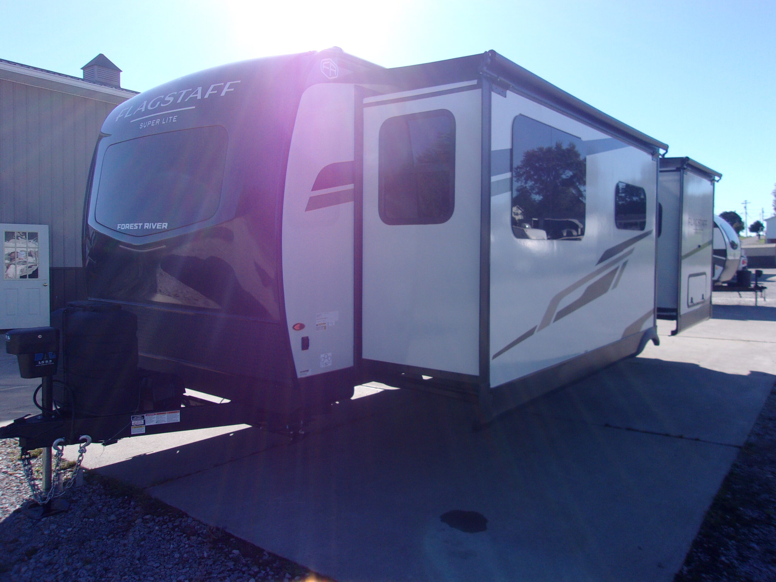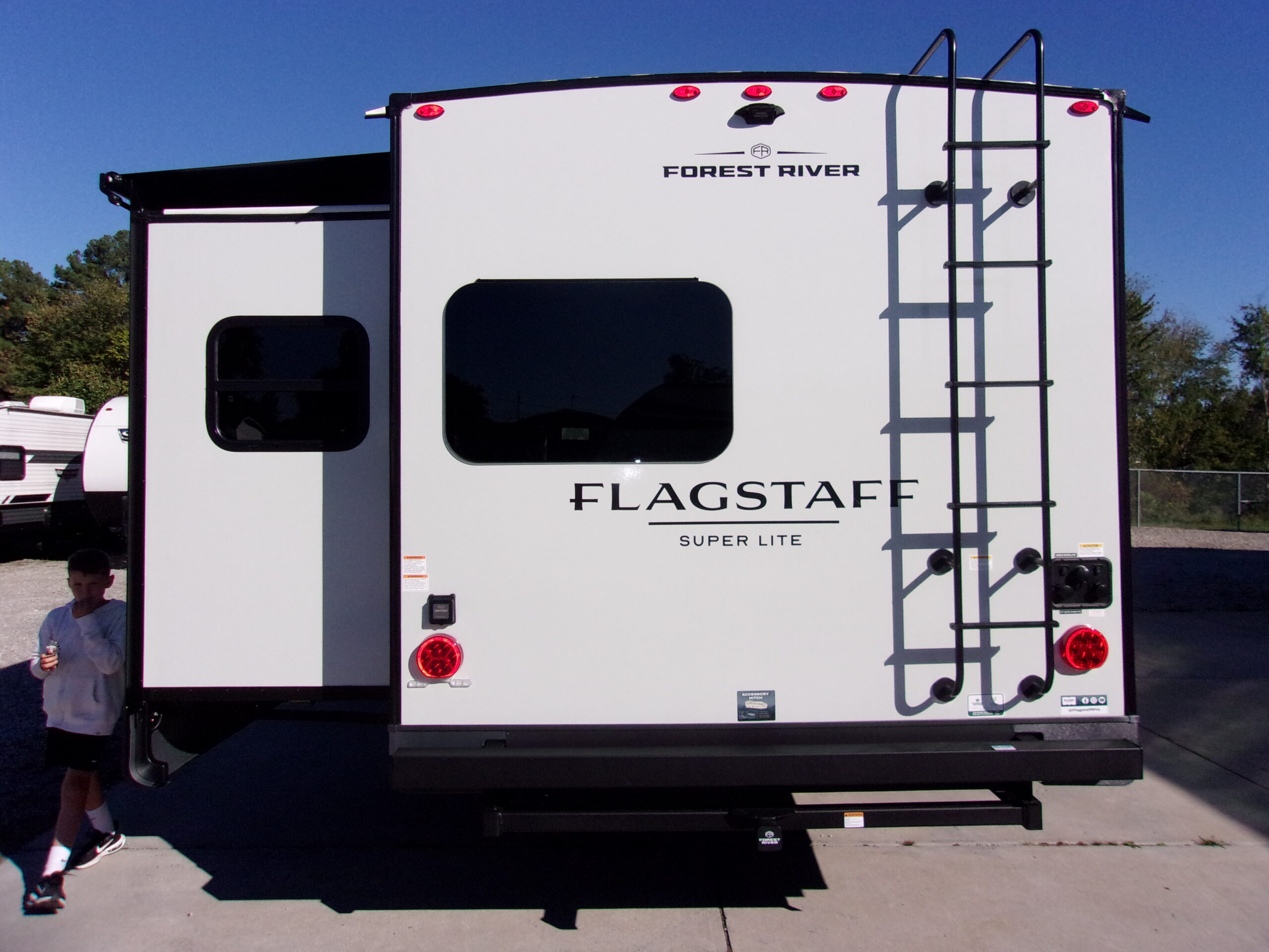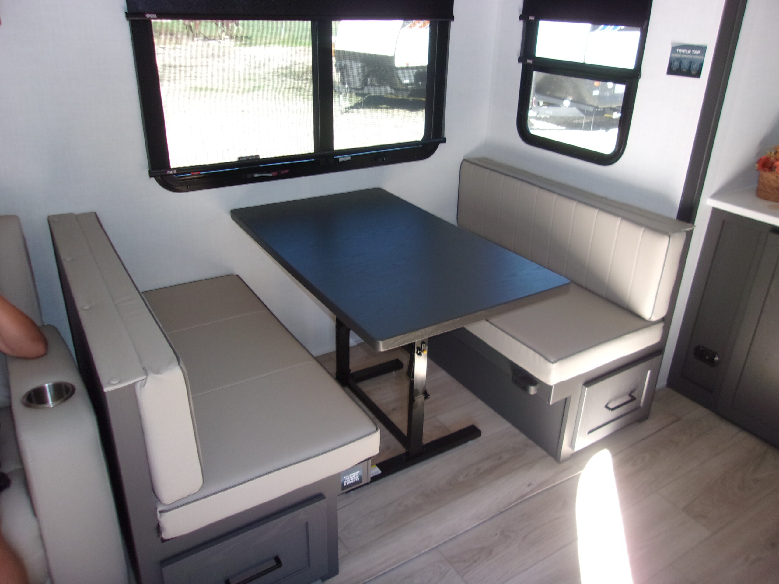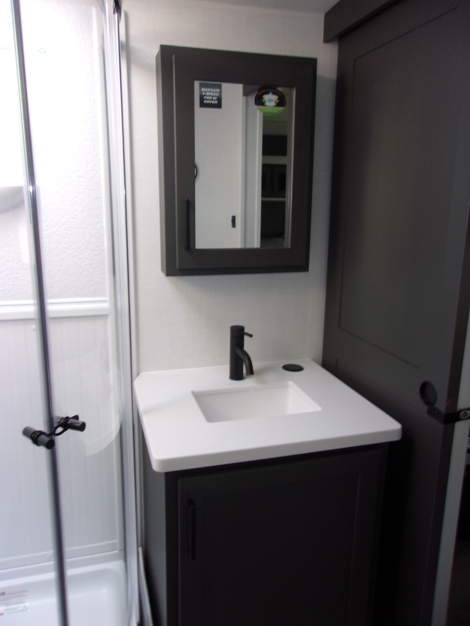 Holy counter space! This front kitchen offers a ton of counter space with a giant window to enhance the camping experience. The 67″ theater seating is conveniently located right in front of the entertainment center and the cozy space heating fireplace. The master bedroom offers a big 60″x 80″ queen bed slide out which makes the room feel residential. This bedroom has a separate entry and exit door that is also covered by the giant 21′ awning
