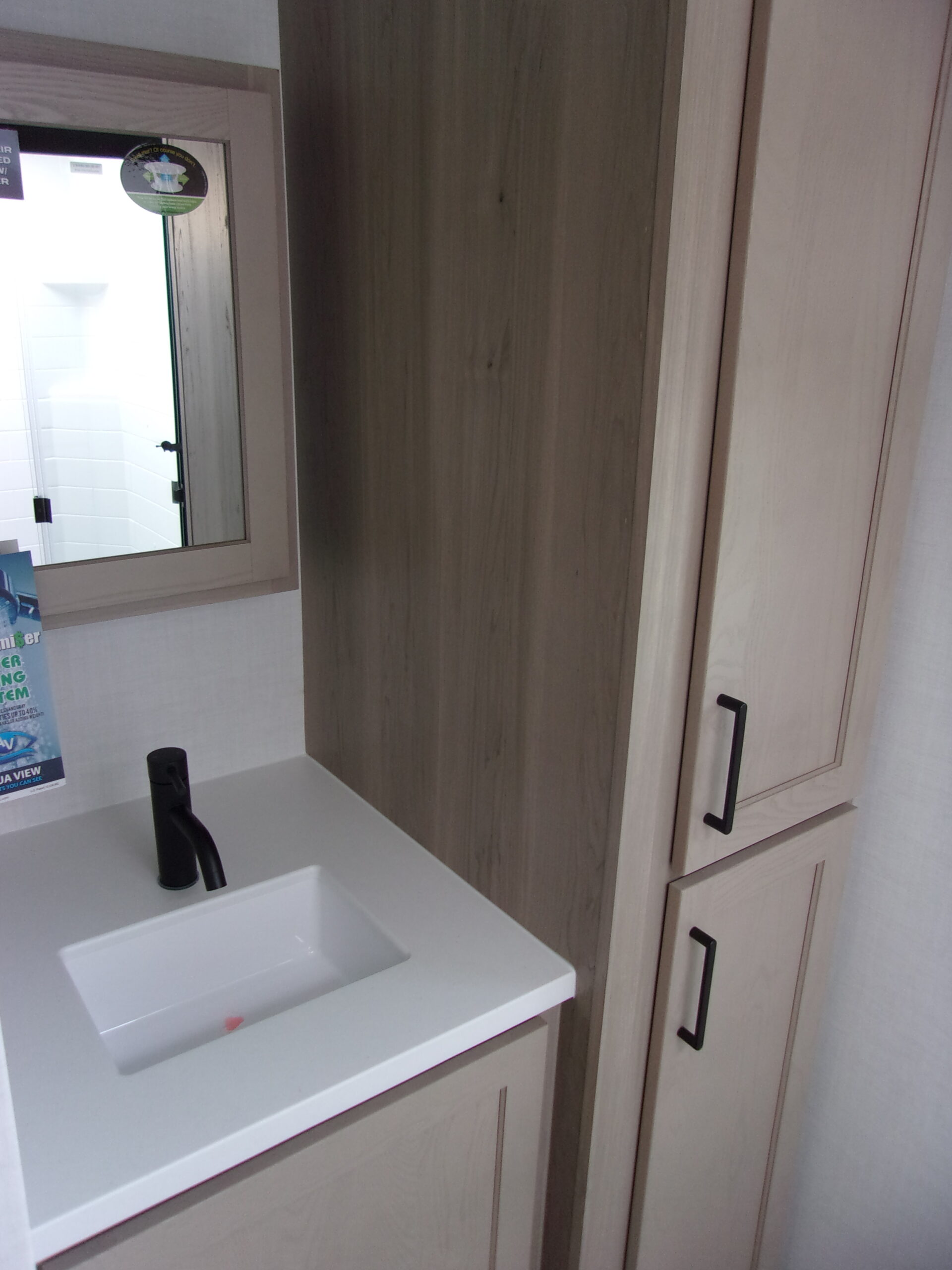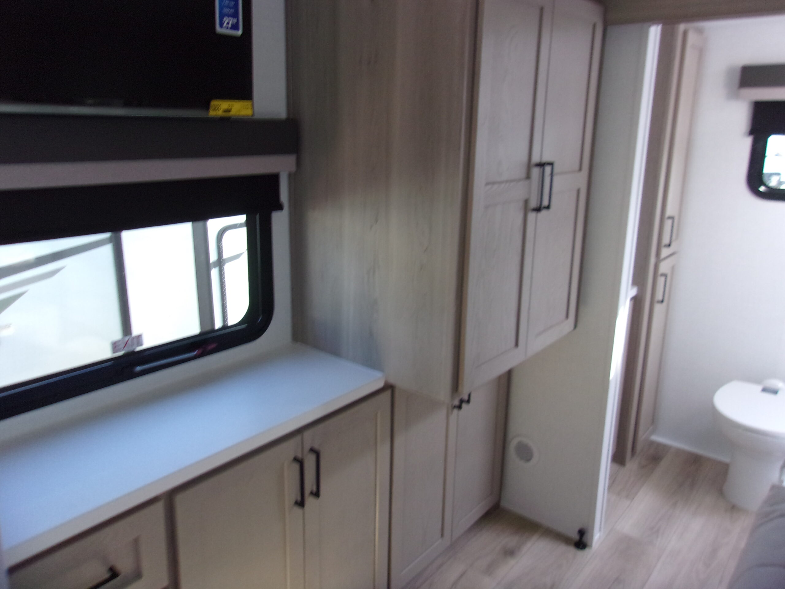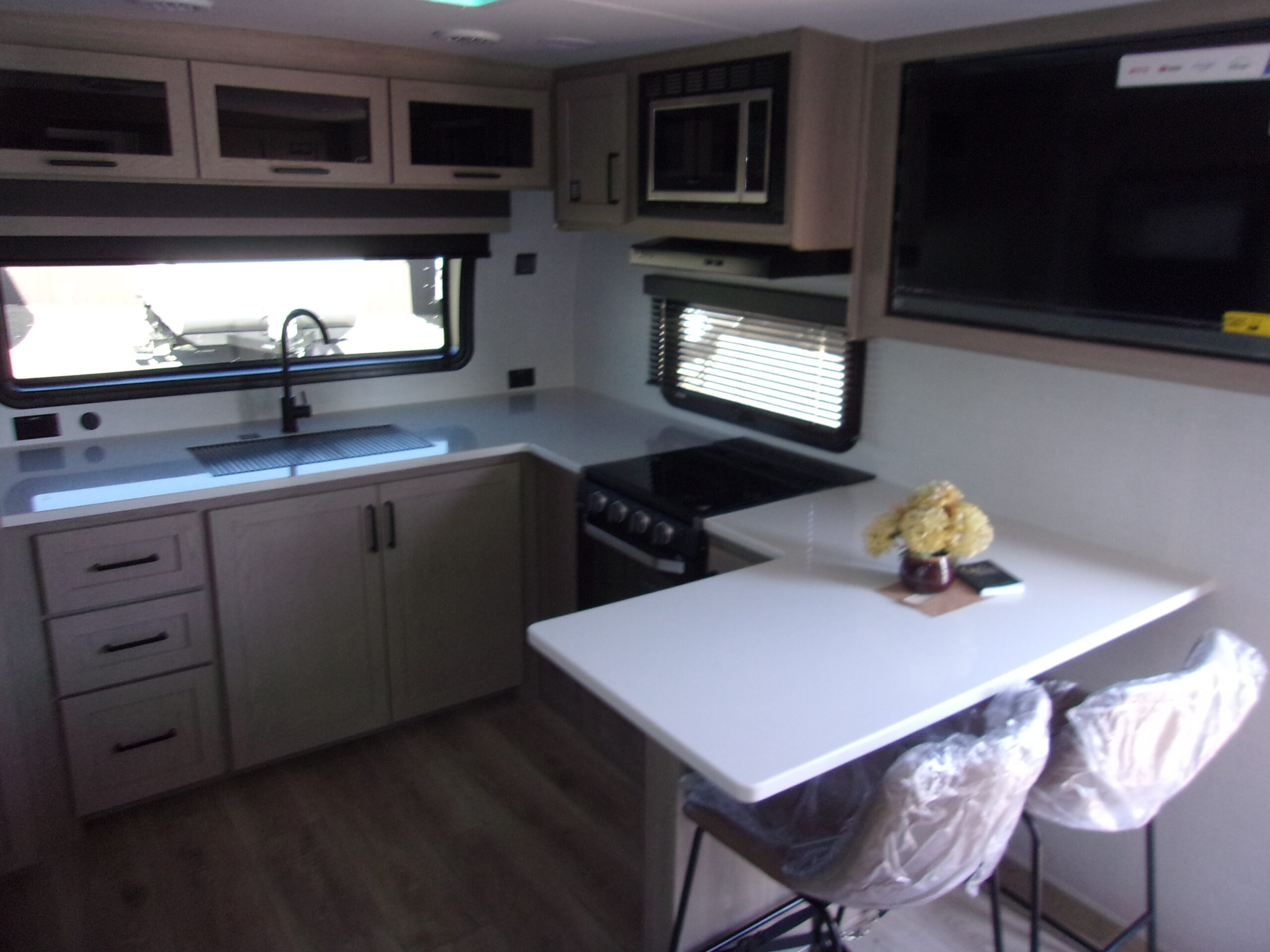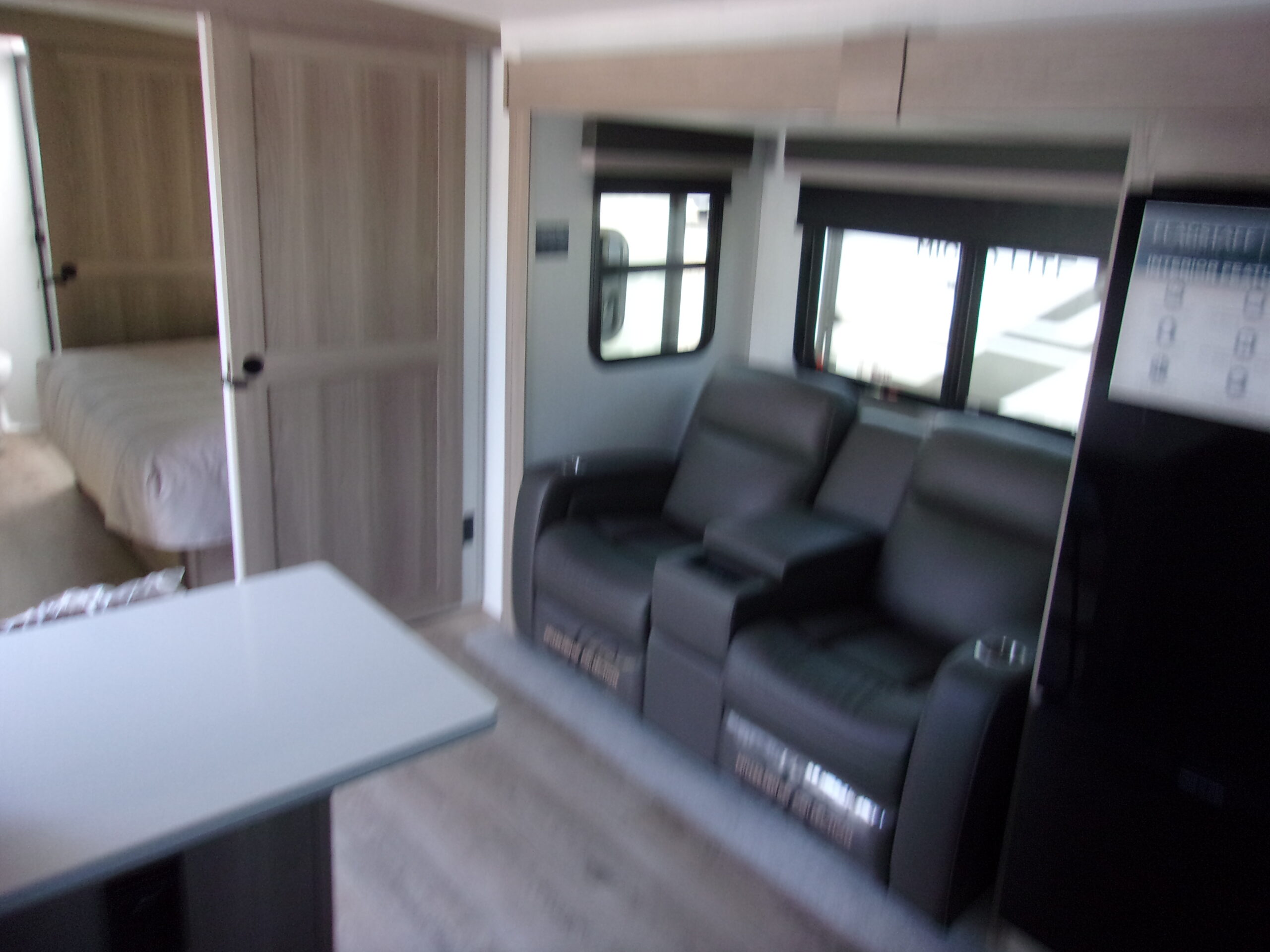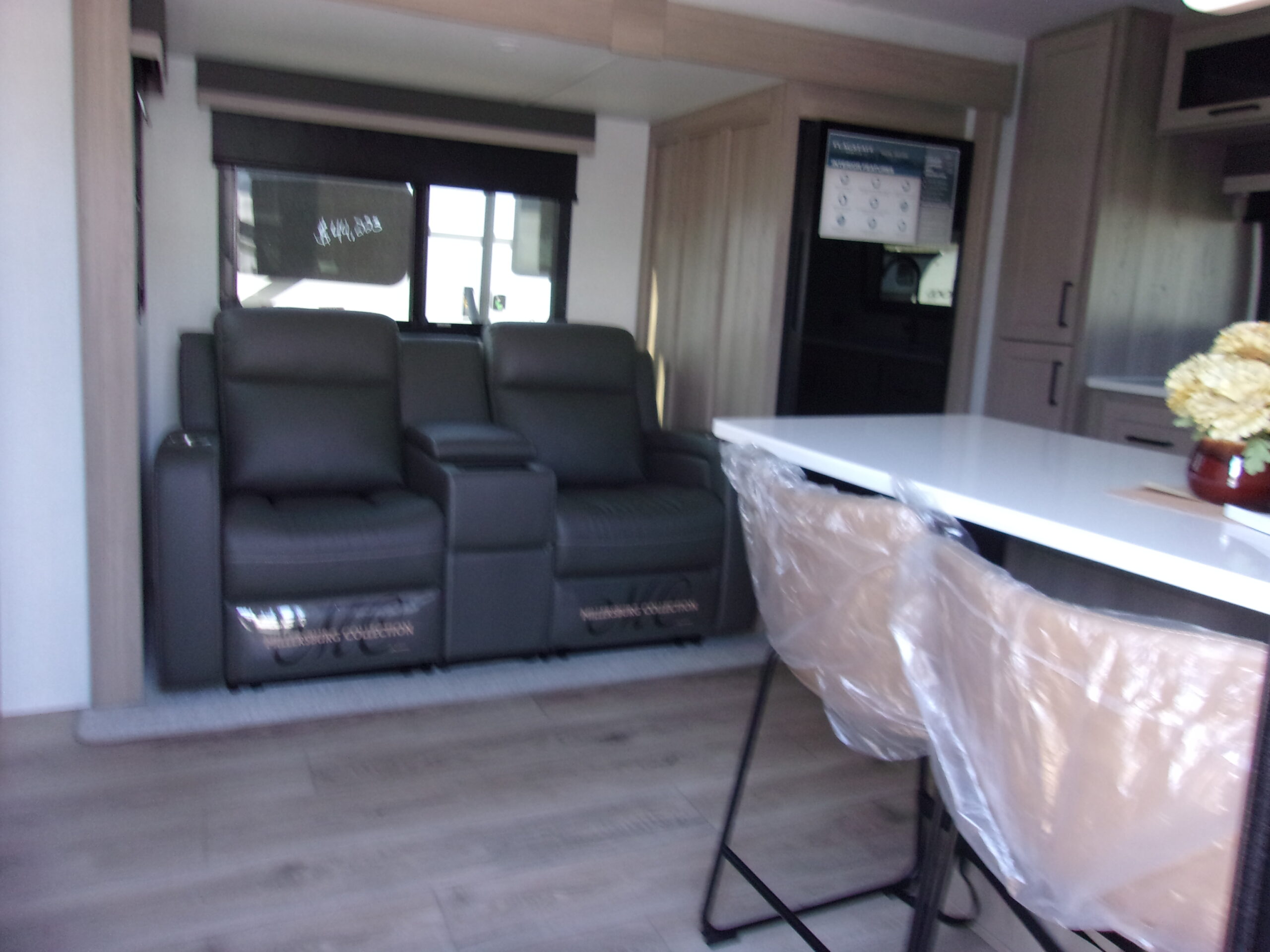 The front kitchen with a large window creates an open, inviting feel with great campsite views. Theater seating faces the entertainment center for easy viewing, with an optional hide-a-bed for guests. The bedroom includes a queen bed in a slide-out, dresser, and wardrobe with washer/dryer prep. A spacious bathroom with a large shower and linen storage adds comfort and convenience, making this coach feel like home.